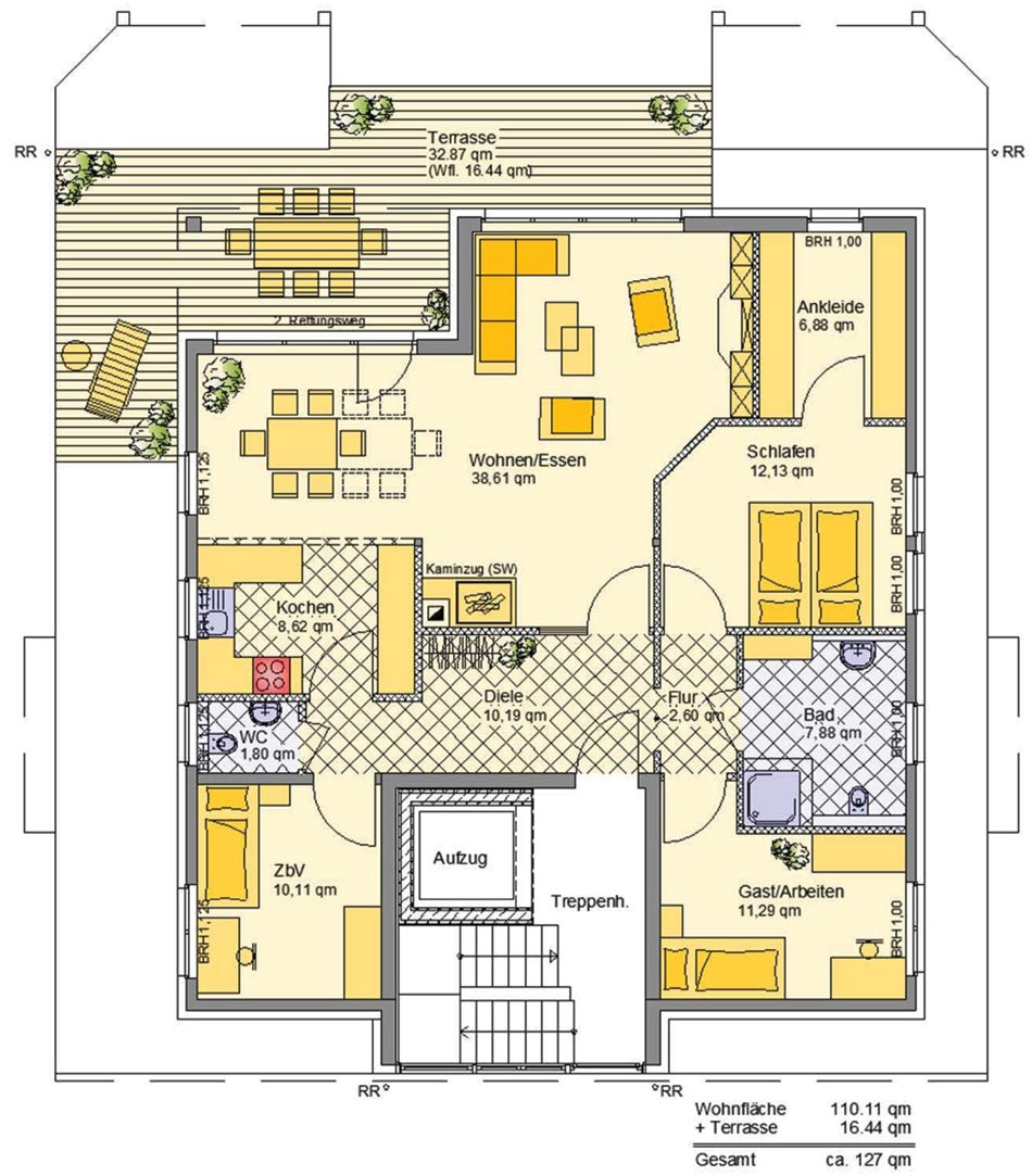 Zimmer: Wohnen/Essen/Kochen, Schlafzimmer, Ankleide, Kinderzimmer, Badezimmer, Gäste-WC, Gästezimmer, Dachterrasse